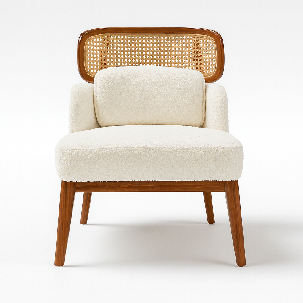 Crafted from warm teak wood, the frame offers both structure and organic appeal, while the plush bouclé seat provides a soft, tactile contrast. The result is a chair that feels nostalgic yet refreshingly current—an ideal accent for interiors that celebrate timeless design and everyday comfort.