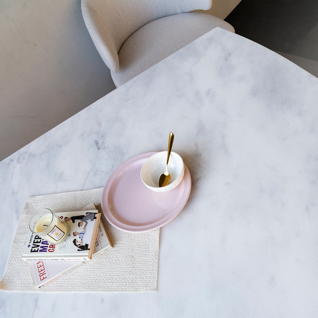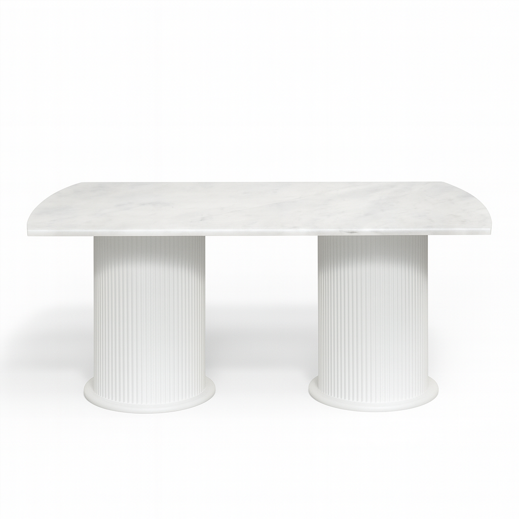 Introducing the Larson 6-Seater Dining Table—a refined union of sculptural elegance and natural beauty. Its smooth, white marble top, gently curved and delicately veined, creates a serene focal point for any dining space.