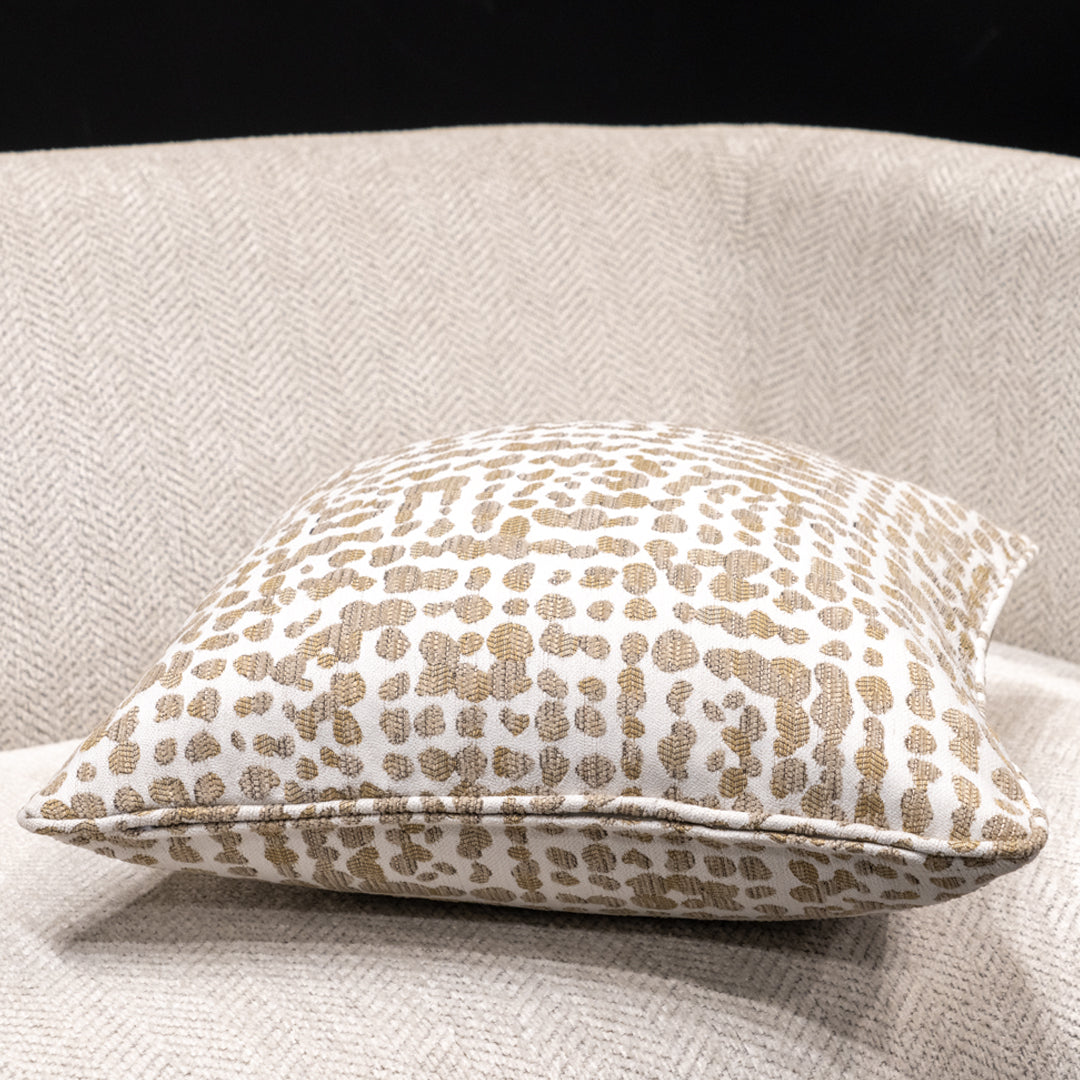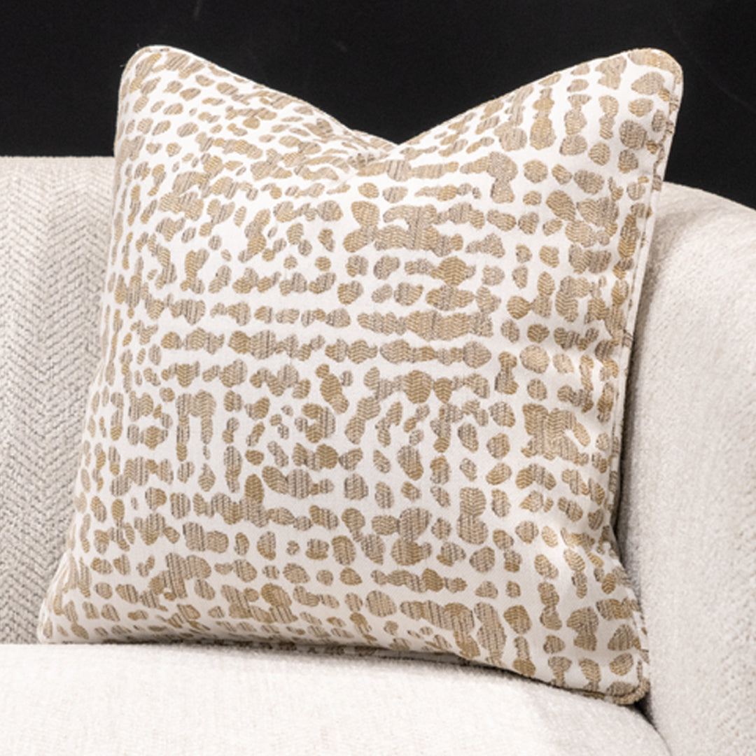 This stylish throw pillow showcases a chic, animal-inspired pattern in soft tan and beige tones on a crisp white background. The organic, spotted design brings a modern yet natural flair, making it an eye-catching accent for any sofa, chair, or bed. Its textured fabric adds dimension and warmth, effortlessly elevating both contemporary and classic interiors.