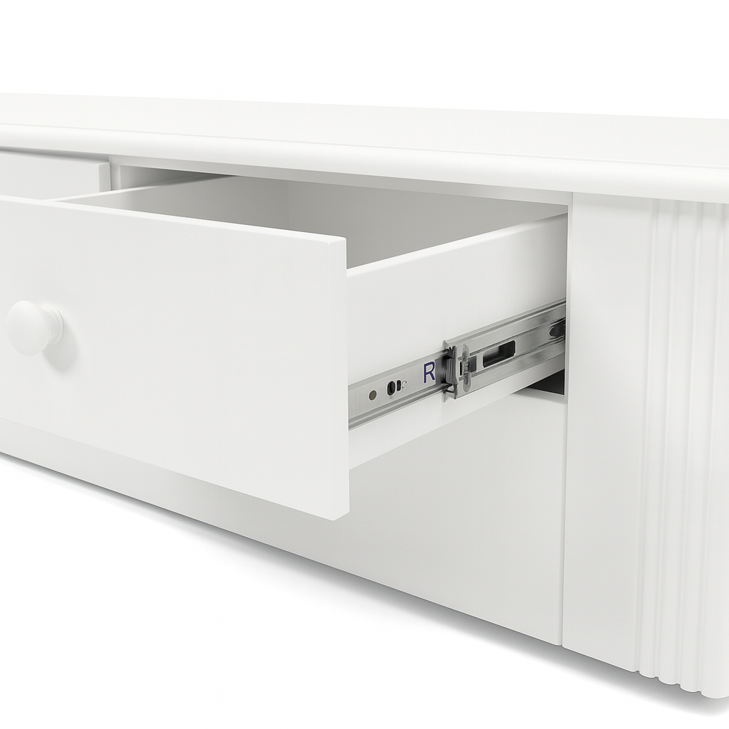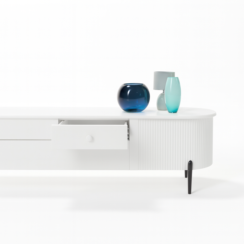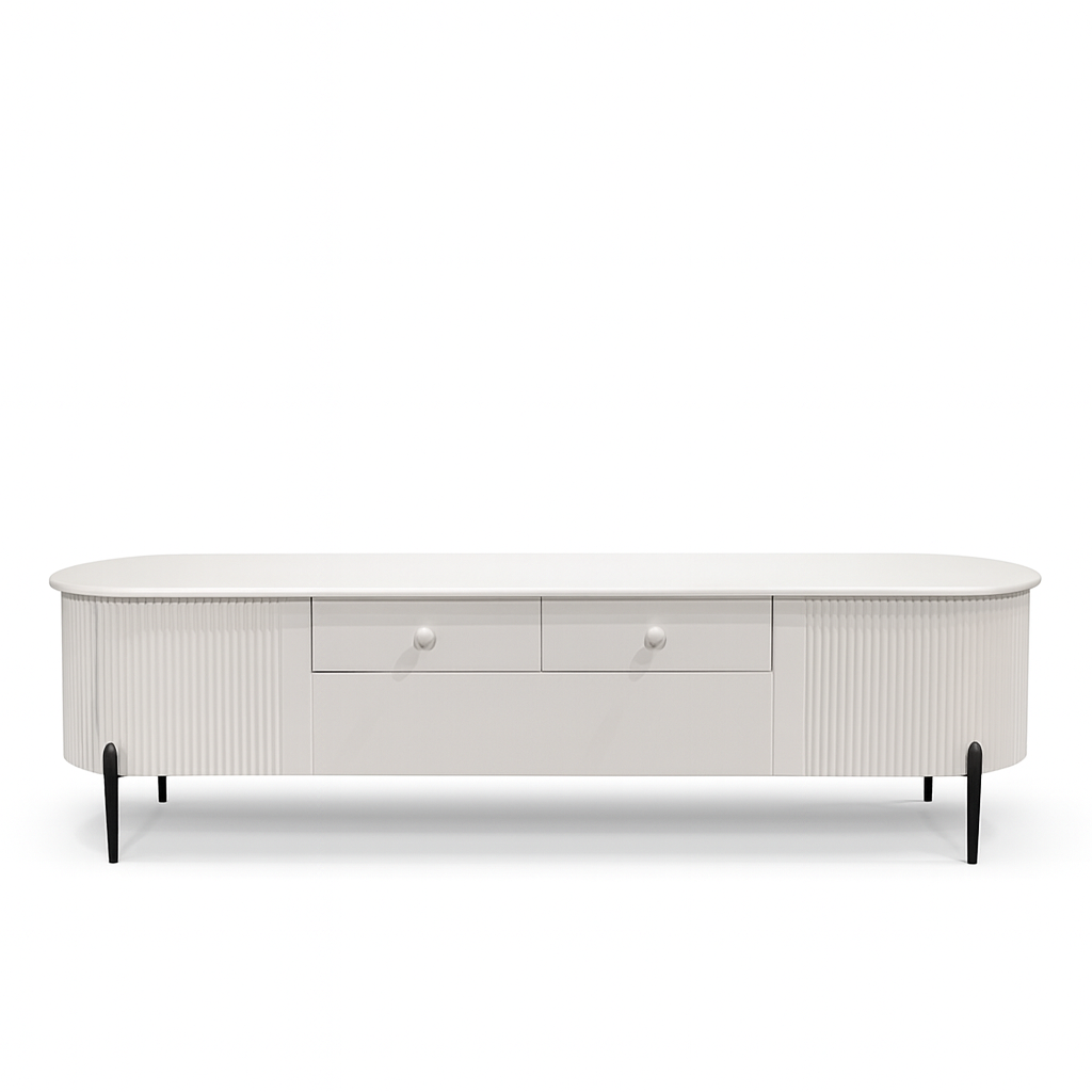 A seamless fusion of soft curves and structured geometry, the Larson TV Unit embodies a refined balance between elegance and architectural precision. The subtly fluted edges introduce a rhythmic texture, contrasting against the smooth expanse of its elongated top. Elevated on slender legs, it achieves a delicate lightness, as if hovering in space, while the interplay of lines and contours evokes a sculptural presence. Every joint and transition is meticulously crafted, creating a visual dialogue between form and function, where timeless design meets contemporary sophistication.