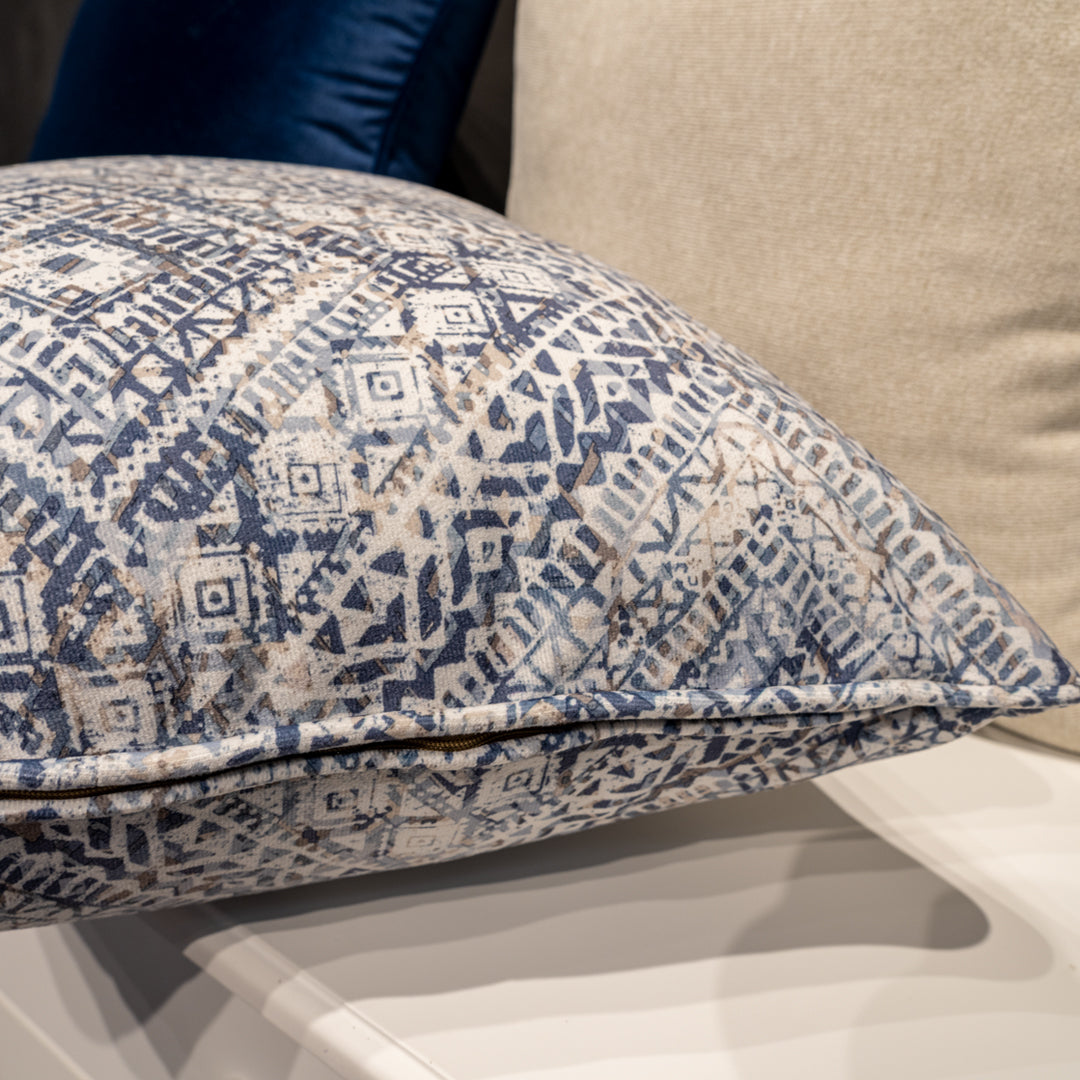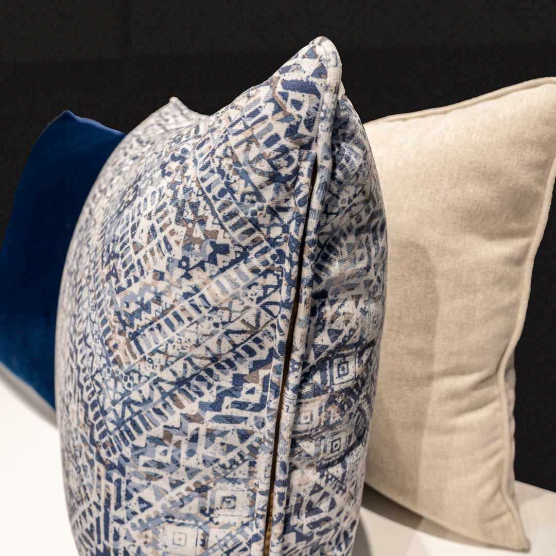 The story continues below with a trio of thoughtfully coordinated cushions. From the depth of navy velvet to the subtle texture of a woven geometric print, and the grounding calm of a soft beige neutral, each pillow echoes elements of the artwork above—creating a seamless, elegant dialogue between wall and furniture.