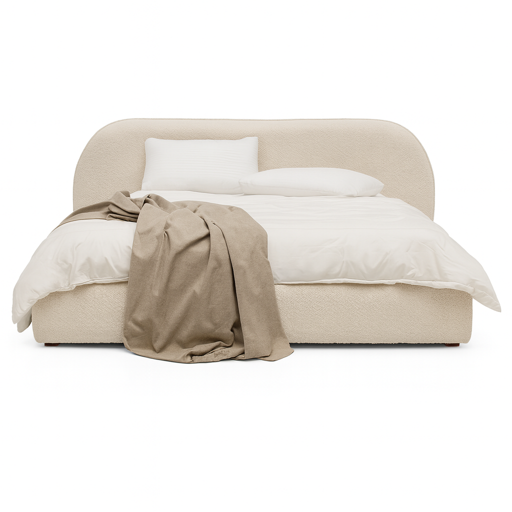 A study in modern serenity, this upholstered bed pairs a gently curved headboard with luxurious textured fabric, creating a tranquil and elegant presence. Its sleek, minimalist silhouette and neutral palette make it effortlessly adaptable to a range of interiors.