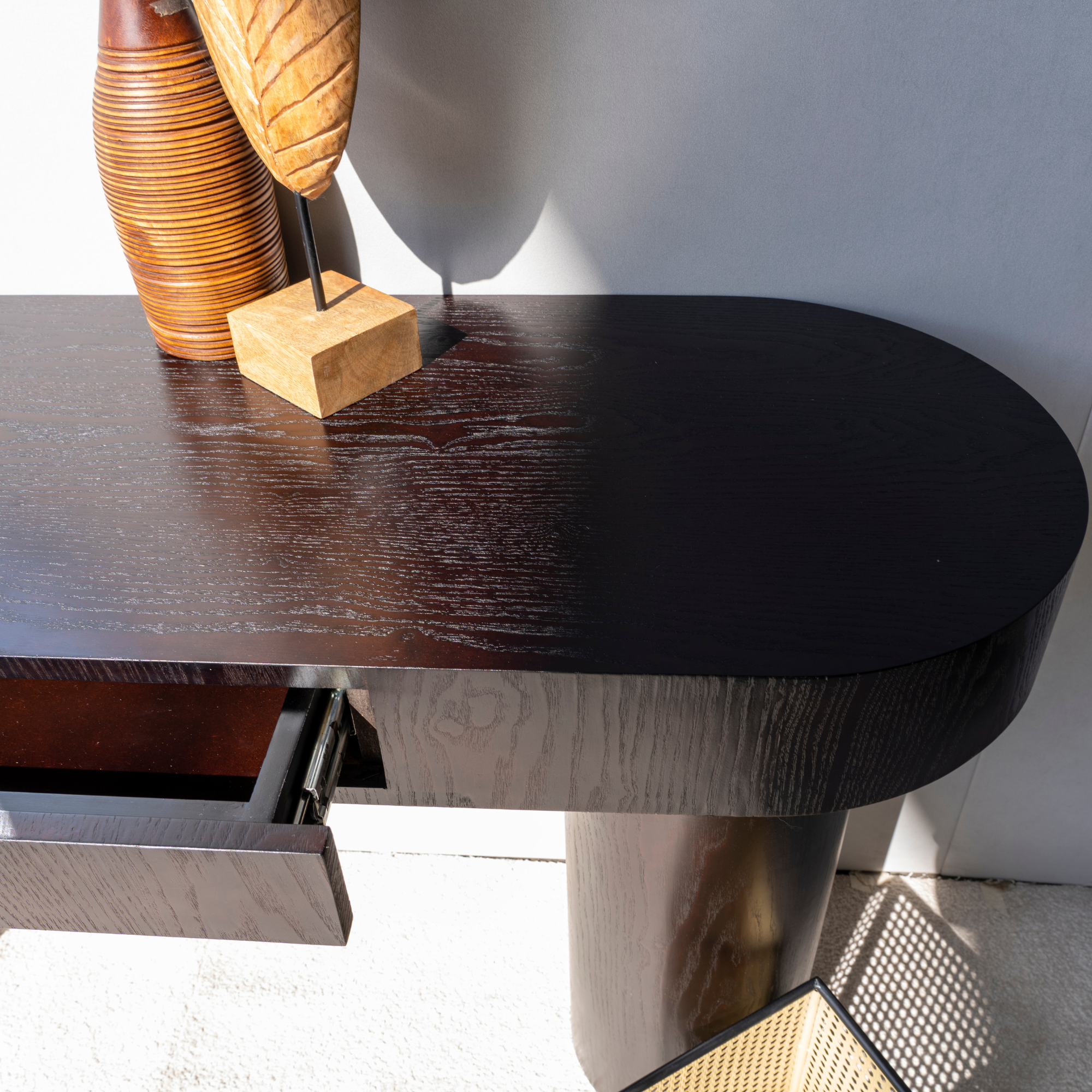The Percia Console redefines modern elegance with bold simplicity. Its sleek, oval-shaped top rests upon two sculptural cylindrical legs, creating a striking silhouette that balances form and function. Crafted in a deep, rich wood finish, the piece exudes warmth and sophistication, making it a versatile addition to contemporary interiors.