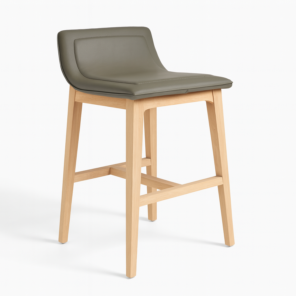 • Phoebe Bar Stool Living Point. Grey fabric seat, wooden legs.