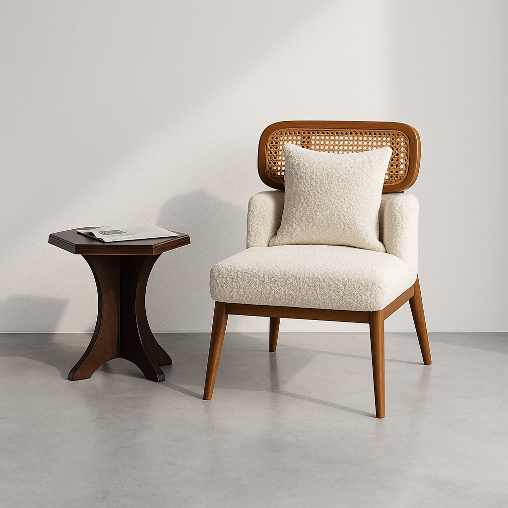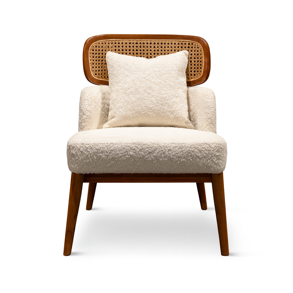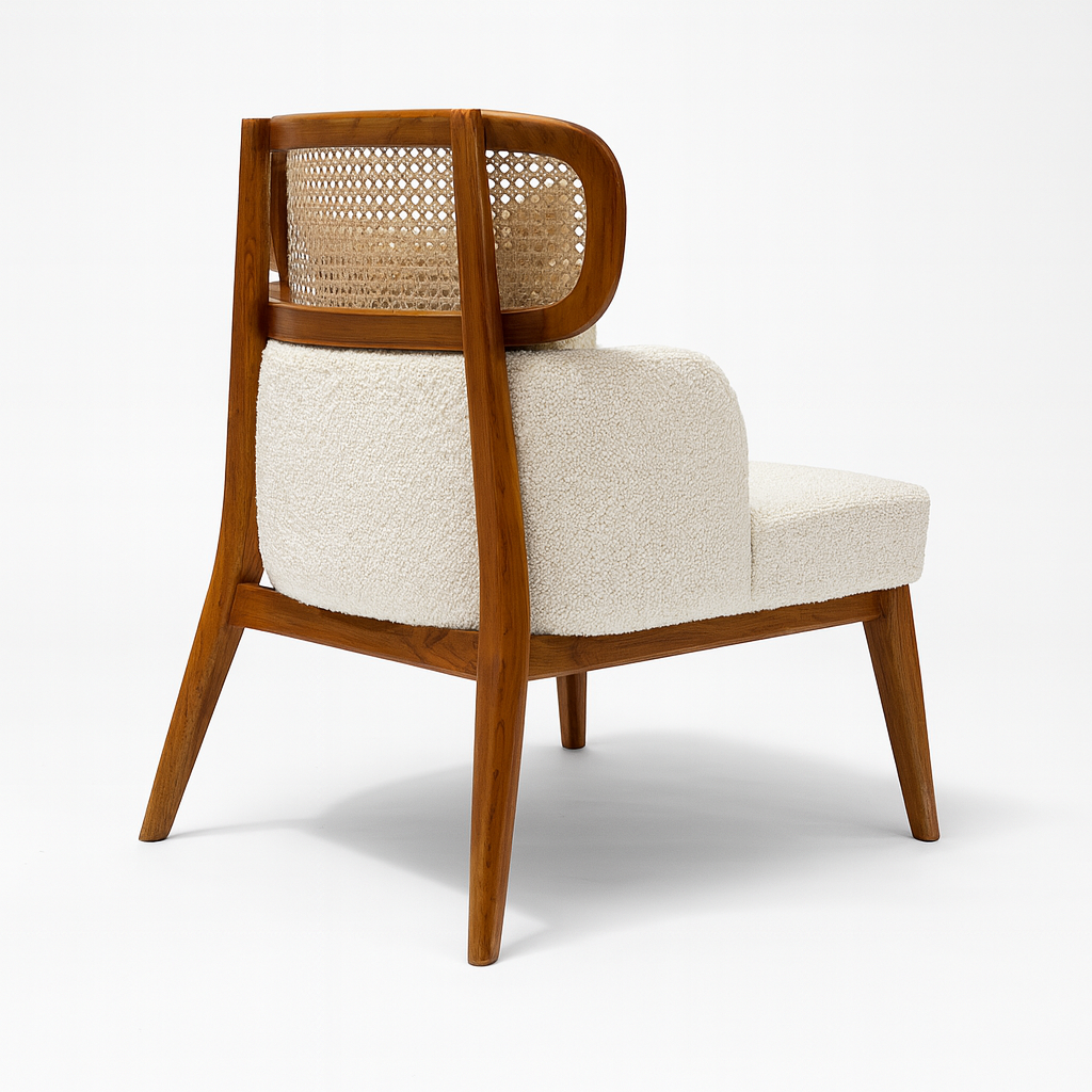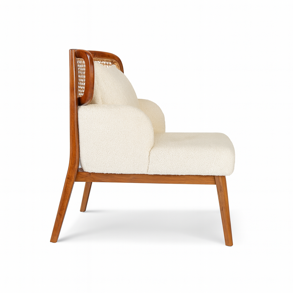 Crafted from warm teak wood, the frame offers both structure and organic appeal, while the plush bouclé seat provides a soft, tactile contrast. The result is a chair that feels nostalgic yet refreshingly current—an ideal accent for interiors that celebrate timeless design and everyday comfort.